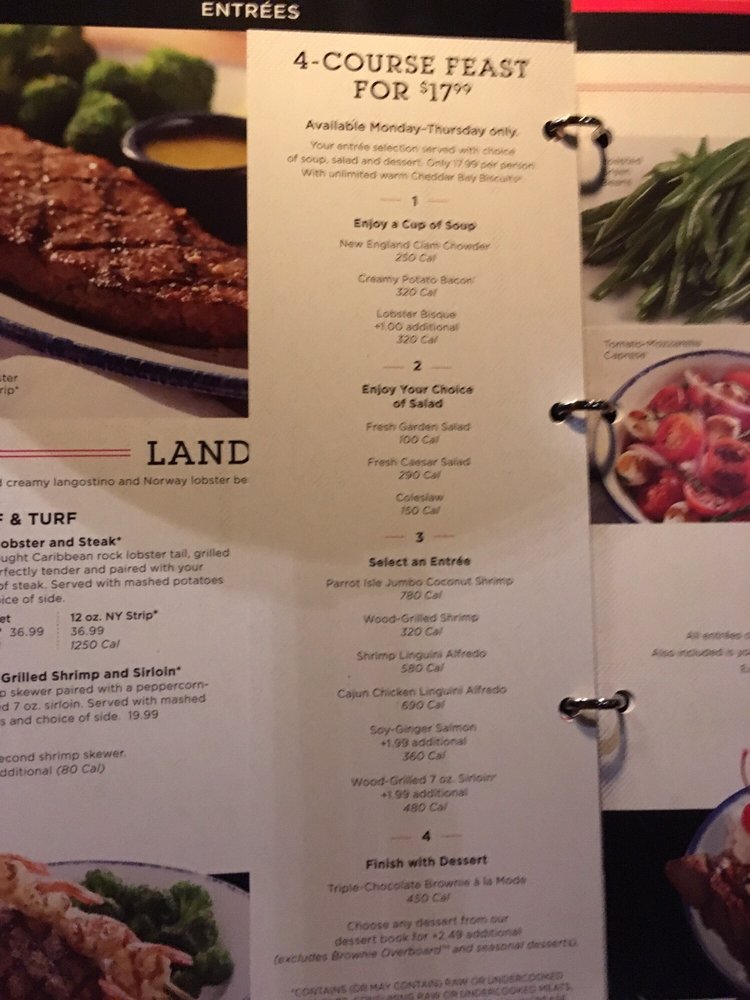 Cheddar Bay Biscuits (160 cal each) - Freshly Baked from Scratch Every 15 Minutes, Clam Chowder (240 cal), Lobster Bisque (310 cal), House Salad (160 cal), Caesar Salad (360 cal), Coleslaw (110 cal)